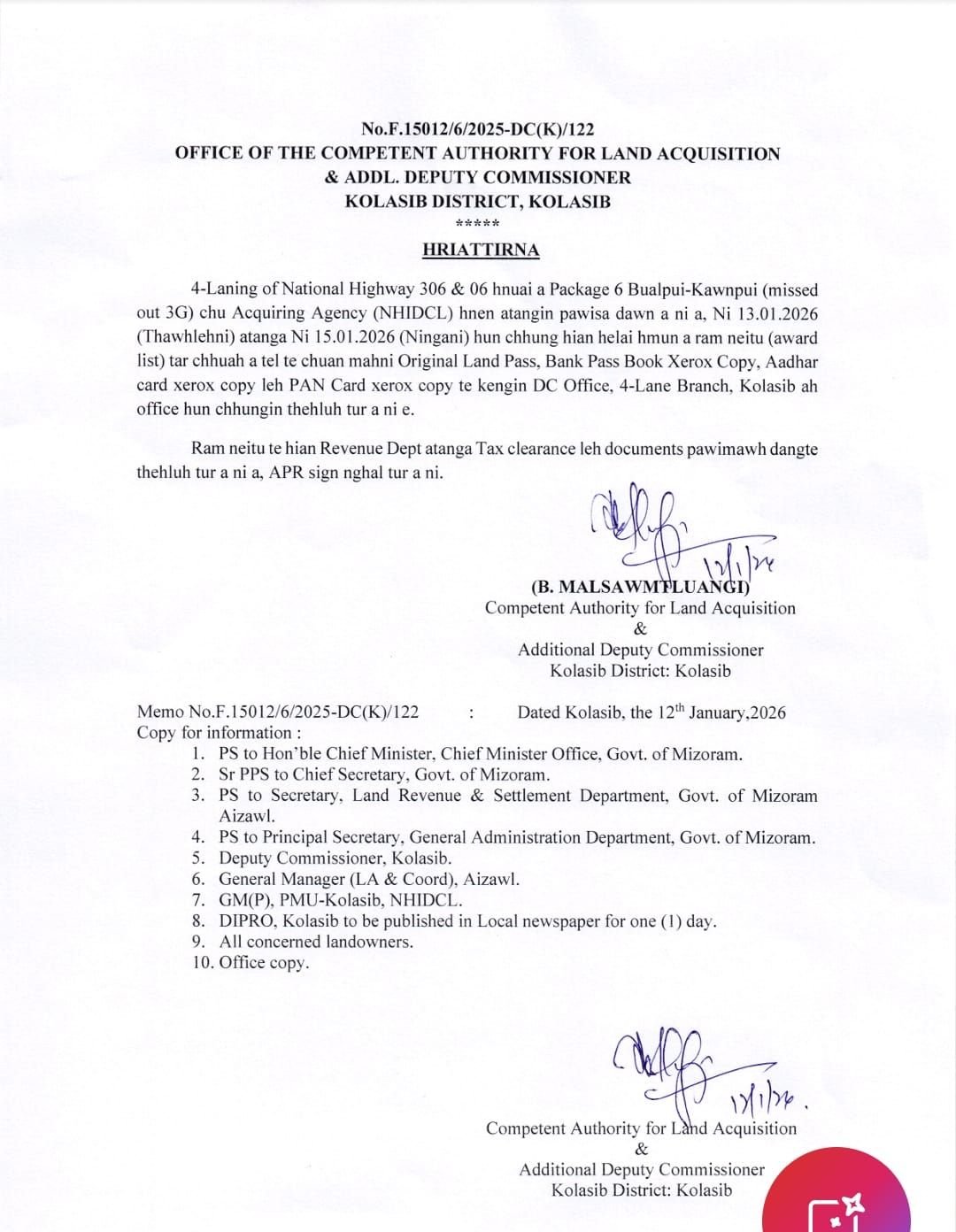 Kolasib District Additional DC Pi B. Malsawmtluangi, MCS, Competent Authority for Land Acquisition (CALA) ni bawk chuan nimin Dt 12....