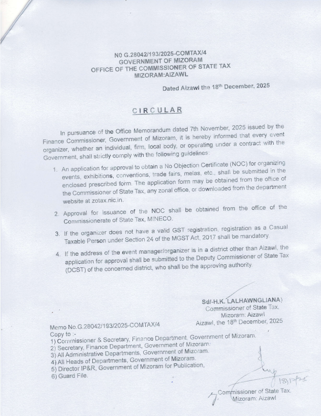Aizawl, 14th January, 2026 : November ni 7, 2025-a Finance Commissioner, Government of Mizoramin Office Memorandum a lo tihchhuah tawh...