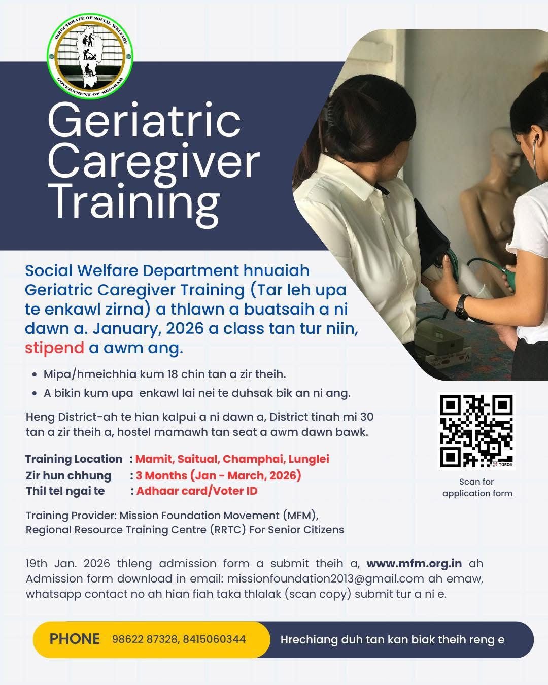 Tar / Upa te mumal zawka enkawl dan zirna Lunglei, Champhai, Saitual leh Mamit-ah te Social Welfare Department leh Mission...